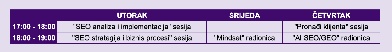 - AI SEO/GEO Mastery radionica: Nauči uspješne metode implementacije koje funkcionišu danas i razvij strateški uvid u to kako AI funkcioniše, dobijajući kroz to sposobnost da uvijek budeš korak ispred budućih promjena.